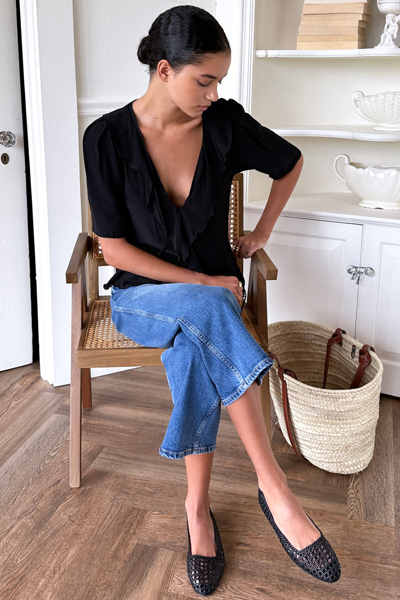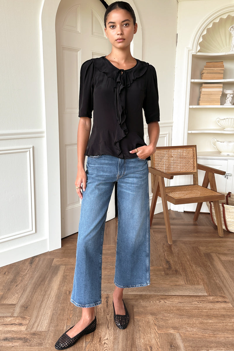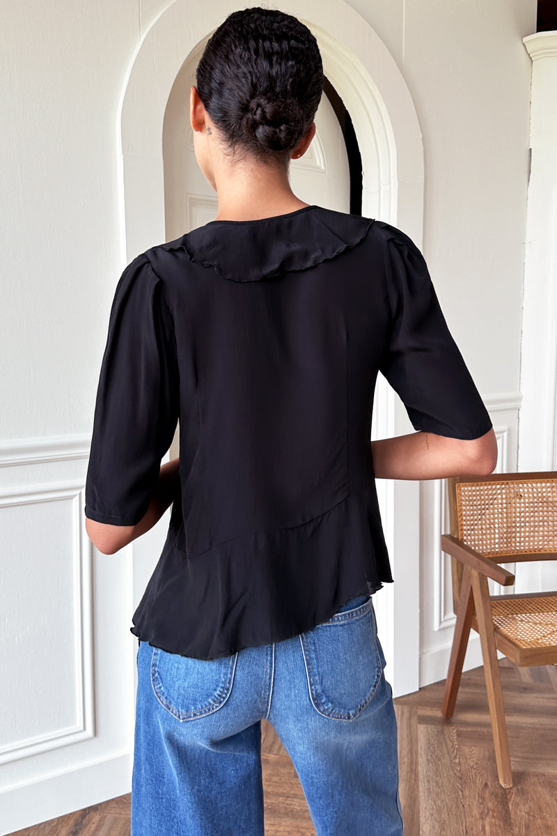 Eco Viscose Rounded neckline Three tie closure at front Ruffle detailing at neckline and hem Half length sleeves Pleating at shoulder Unlined Made in NYC XXS: Bust 31", Waist 28",...