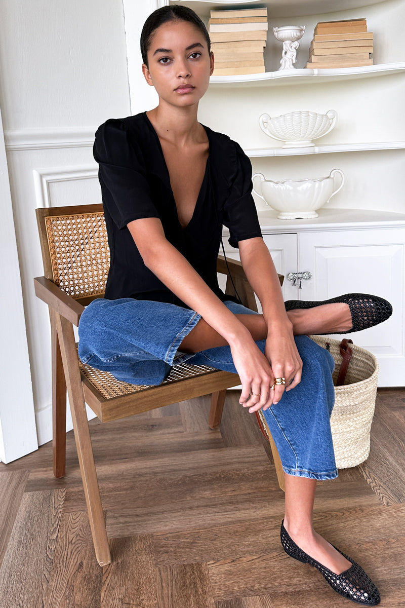 Linen Viscose Button front Princess seams Square neckline Elastic at shoulder and cuff Puff sleeve Ruffle hem Lined Made in NYC