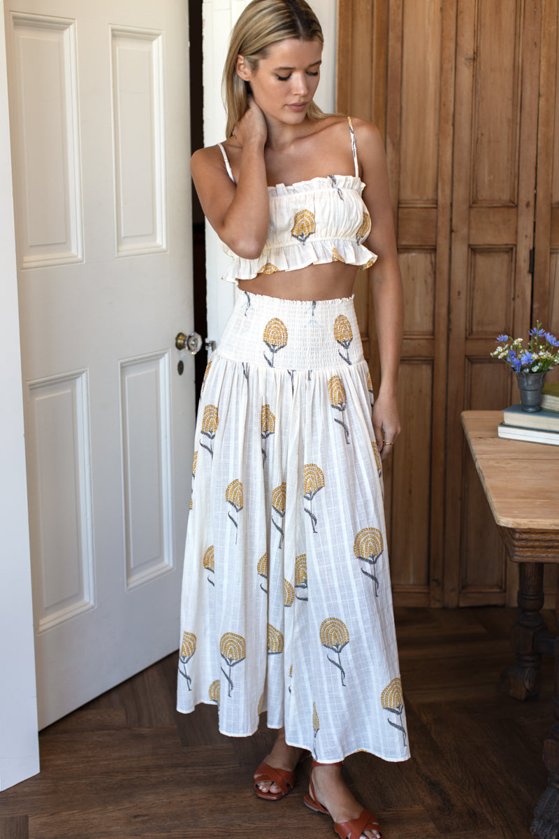 100% Cotton poplin Easy pull on styling Elastic shirred waist band Side seam pockets Subtle A-line shape Wide hem allowance Unlined Made in Rajasthan, India XS/S: Fits 20" to 28"...