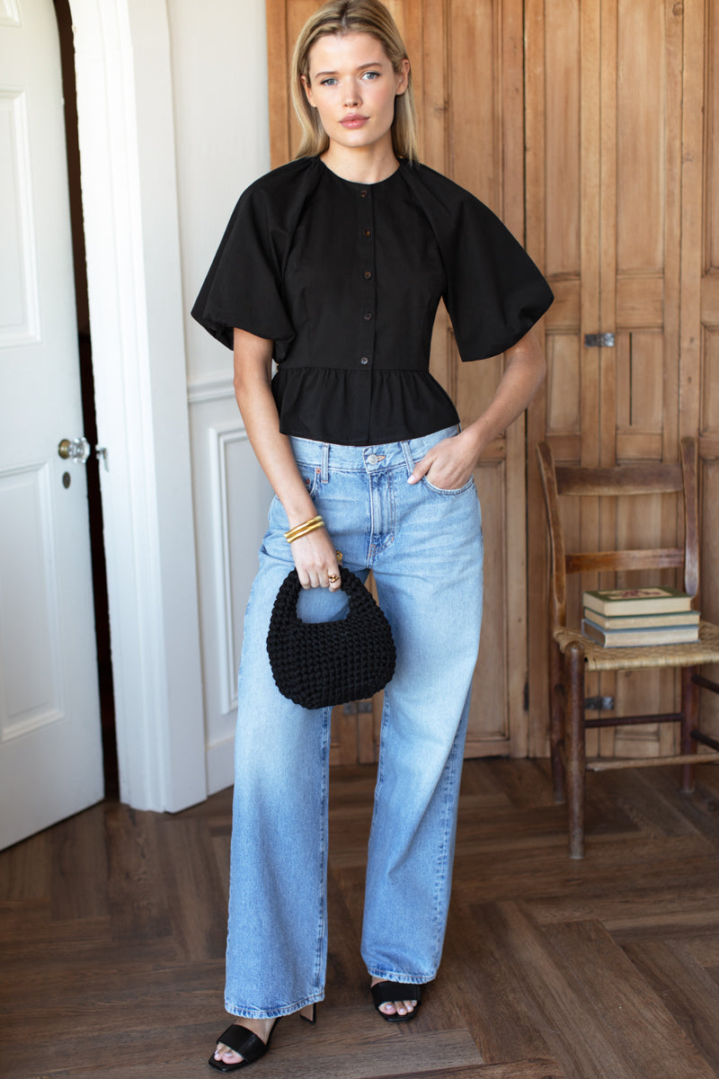 Tencel Organic Cotton rib knit Scoop neckline Button placket with functioning button at front Bracelet length sleeves Cropped length Made in LA