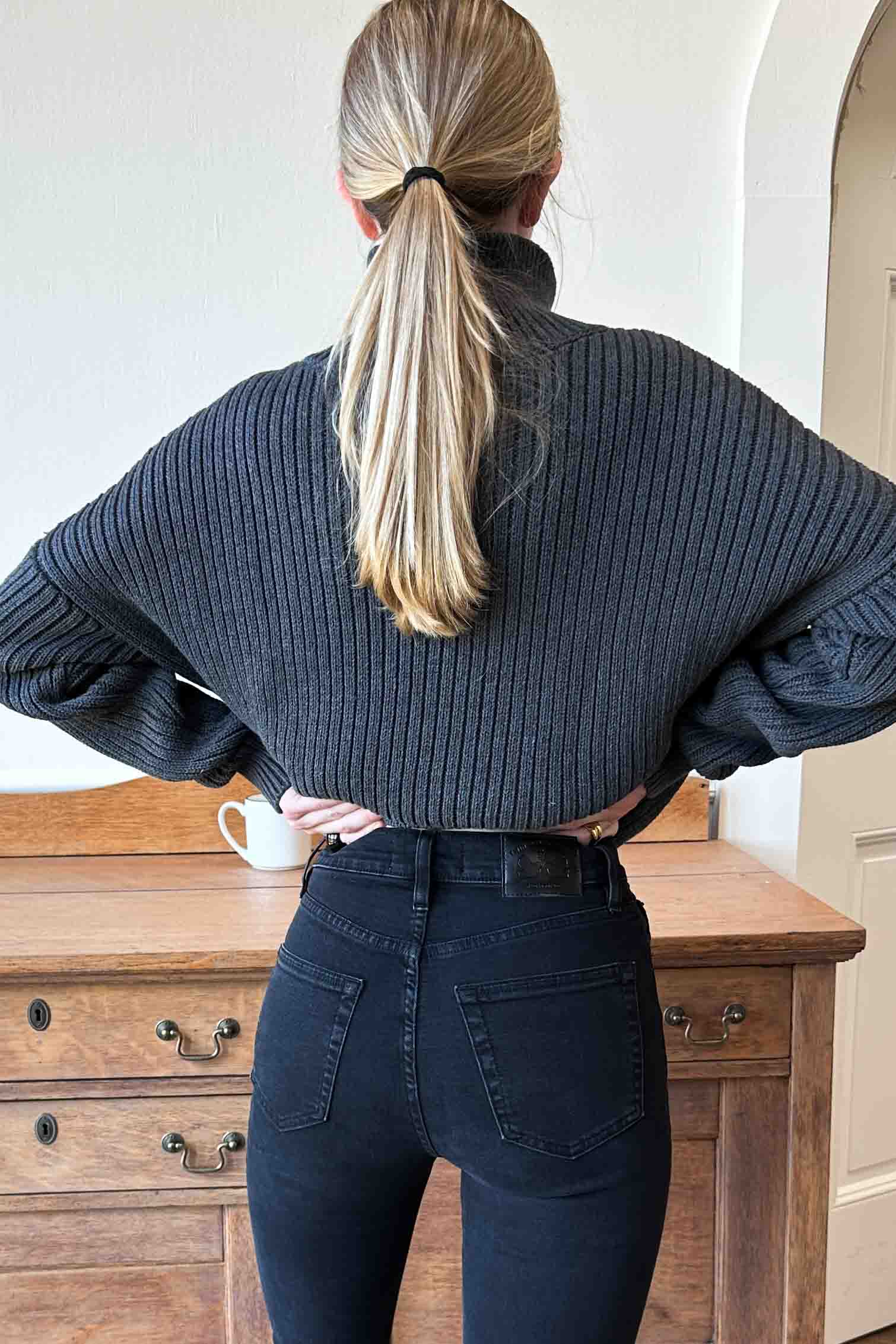 Organic cotton Rib knit Raglan sleeve Funnel neck is 4 1/2" high 5" side seam slits at hem Model is wearing a size small Hand wash and lay flat to...