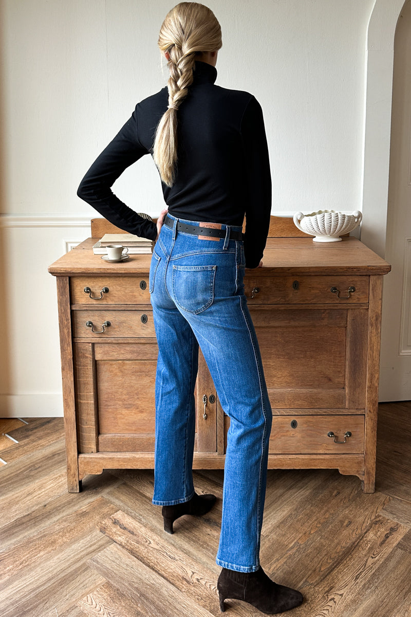 This high rise retro inspired fit sits high at the waist, slim through the hip and straight throughout for a full leg silhouette without being wide. The longer inseam is...