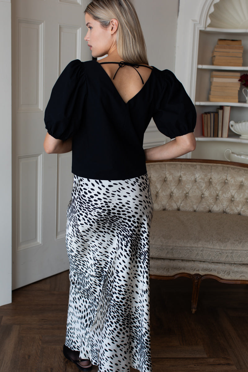 Comfy-polish or party-ready. With Jeans. Luxe-Comfortable, special, joyful. Made in NYC. Stretch Linen blend in our signature leopard print Puff shoulder 7" Balloon sleeve w/ elastic cuff V front +...