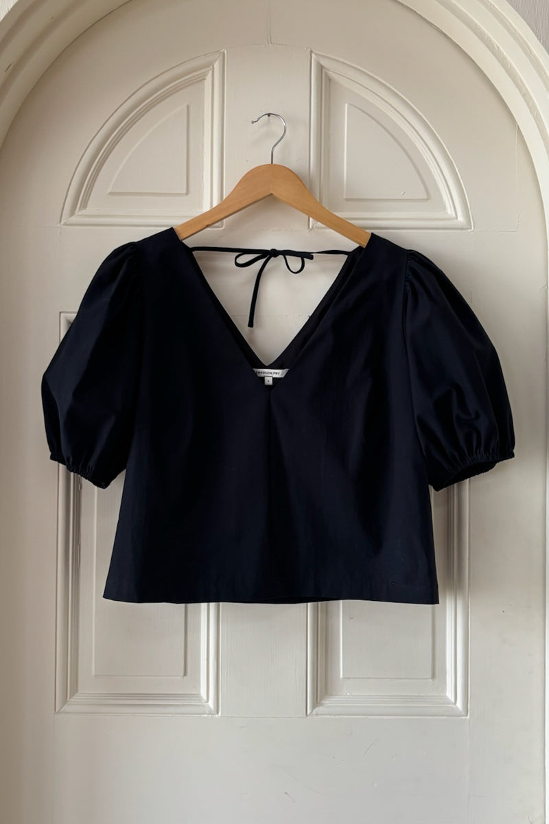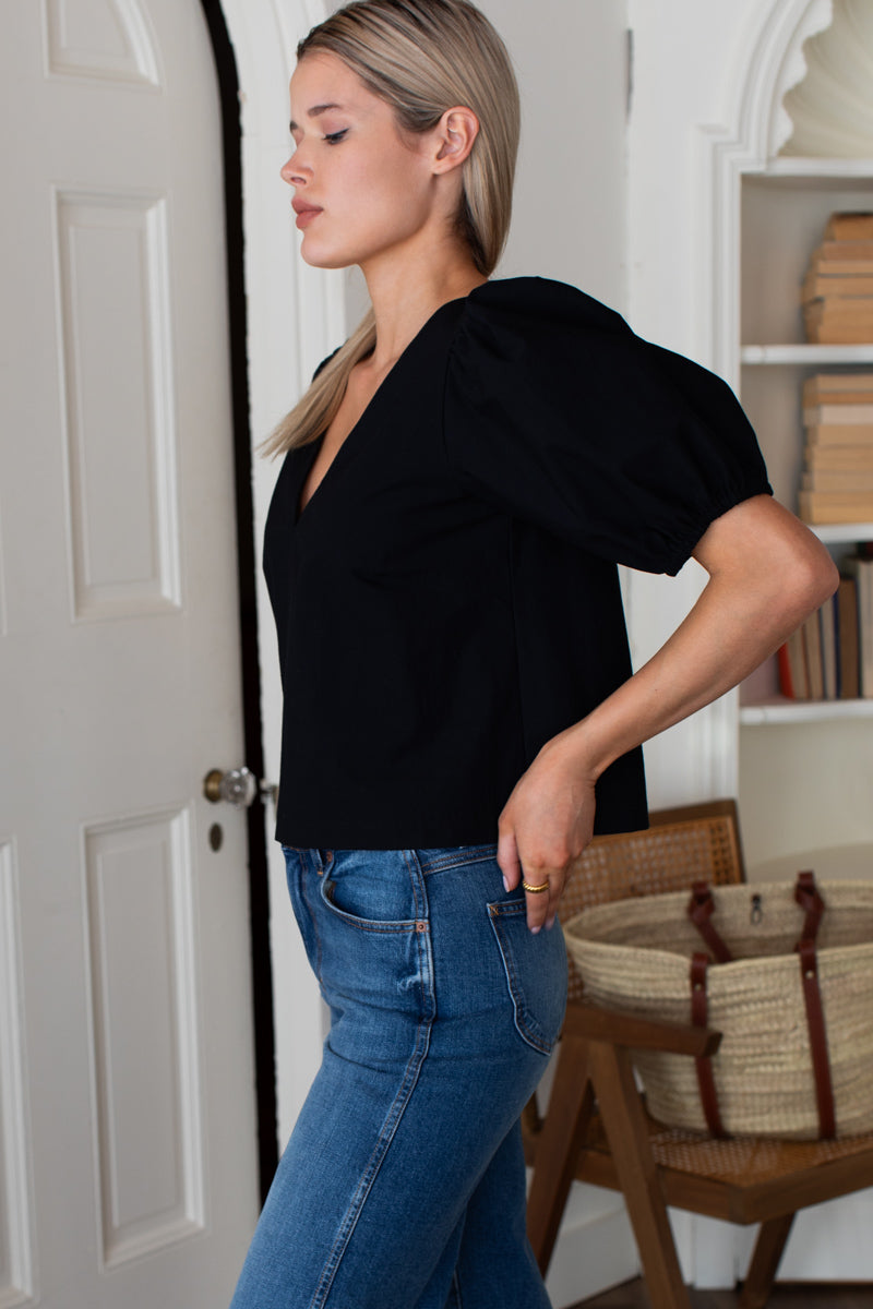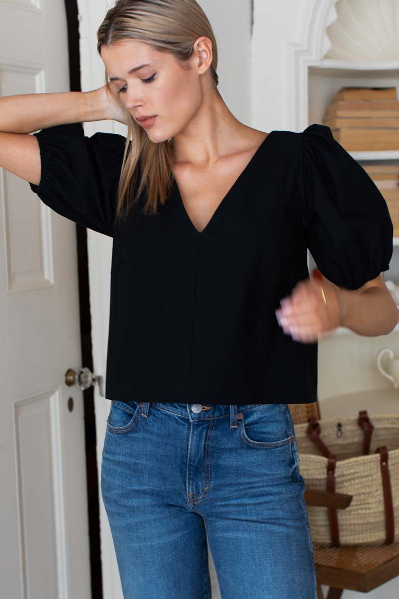 Comfy-polish or party-ready. With Jeans. Luxe-Comfortable, special, joyful. Made in NYC. Eco Viscose Ponte Puff shoulder 7" Balloon sleeve w/ elastic cuff V front + back Lined Made in NYC...