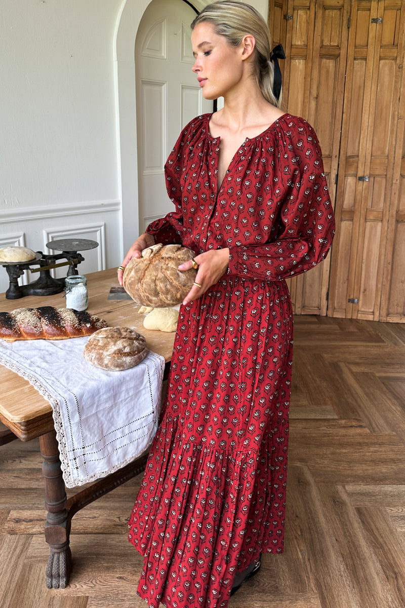 Favorite perfect fit maxi dress with updated size range and longer shirred bodice. Cotton Shirred elastic bodice Button front Square neckline Elastic at shoulder and cuff Puff sleeve Ruffle hem...