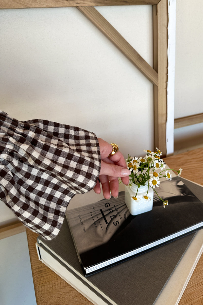 Cotton Decorative jacquard woven detailing Yoked neckline with double ties Gathered little puff shoulder Elastic at cuff Lined Relaxed fit through body Hand wash cold, gentle + line dry Made...