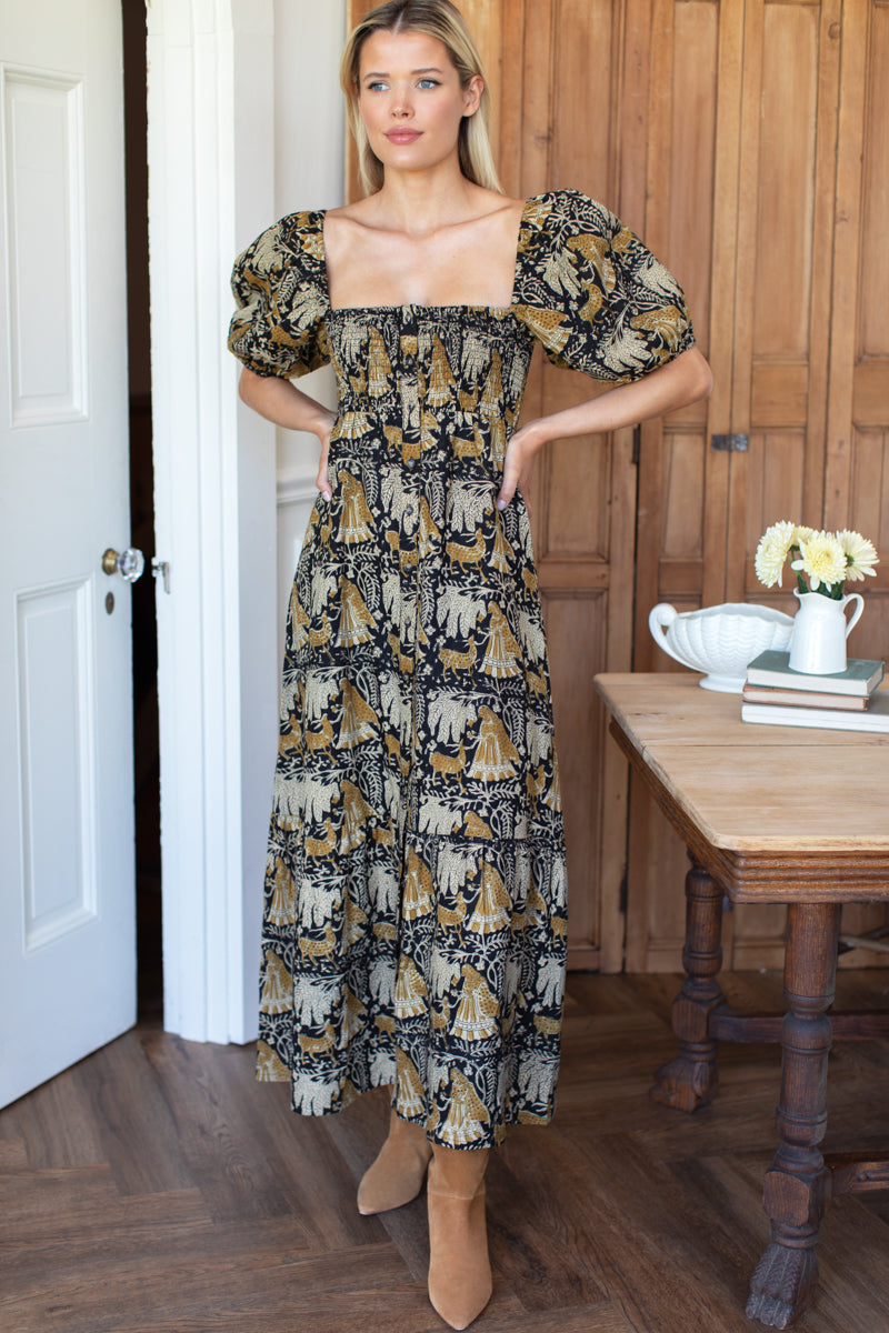 Favorite perfect fit maxi dress with updated size range and longer shirred bodice. Cotton Shirred elastic bodice Button front Square neckline Elastic at shoulder and cuff Puff sleeve Ruffle hem...